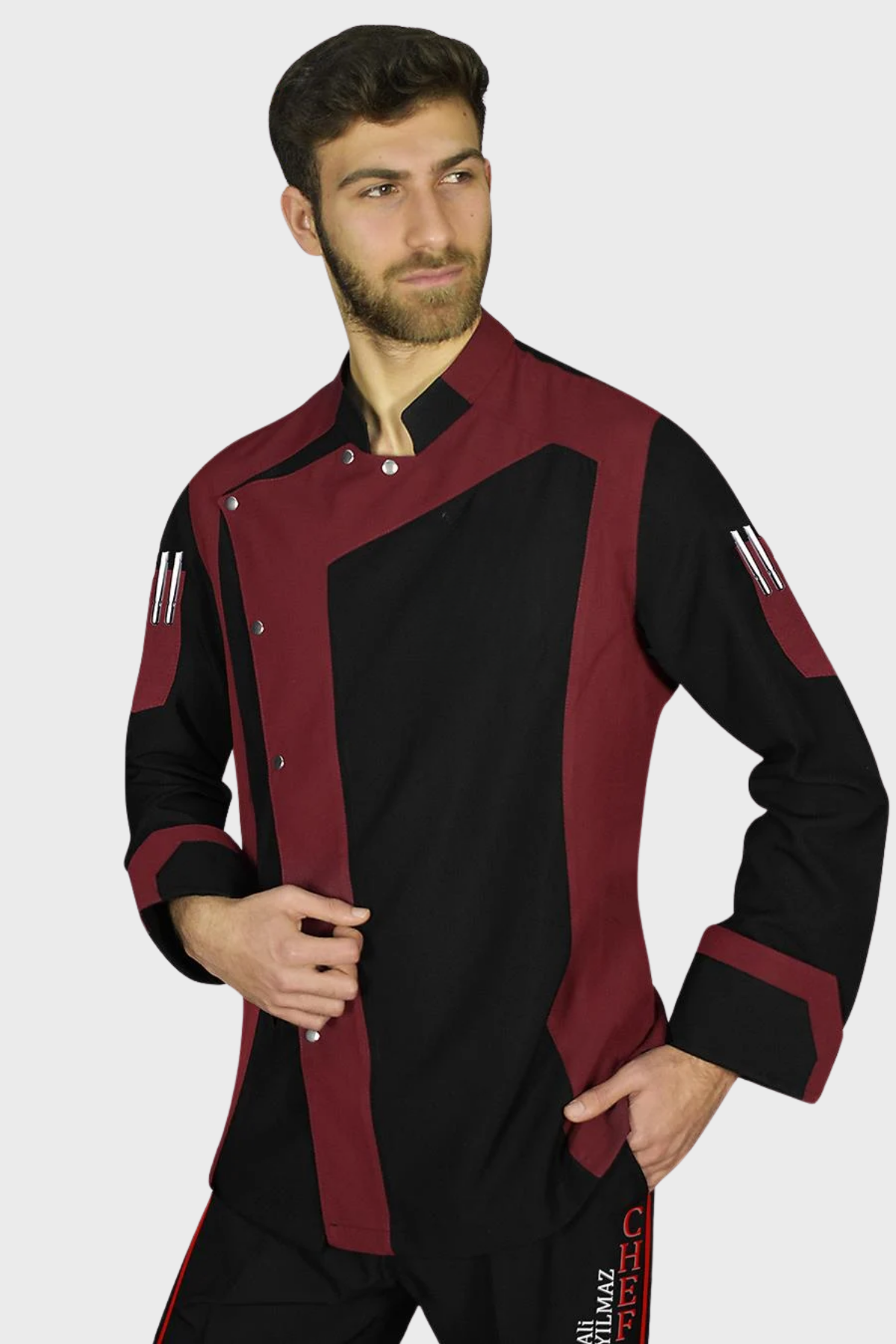 Kral Şef aşçı Ceketimiz bordo ile siyah rengin mükemmel uyumu göz önüne alarak tasarlanmıştır.